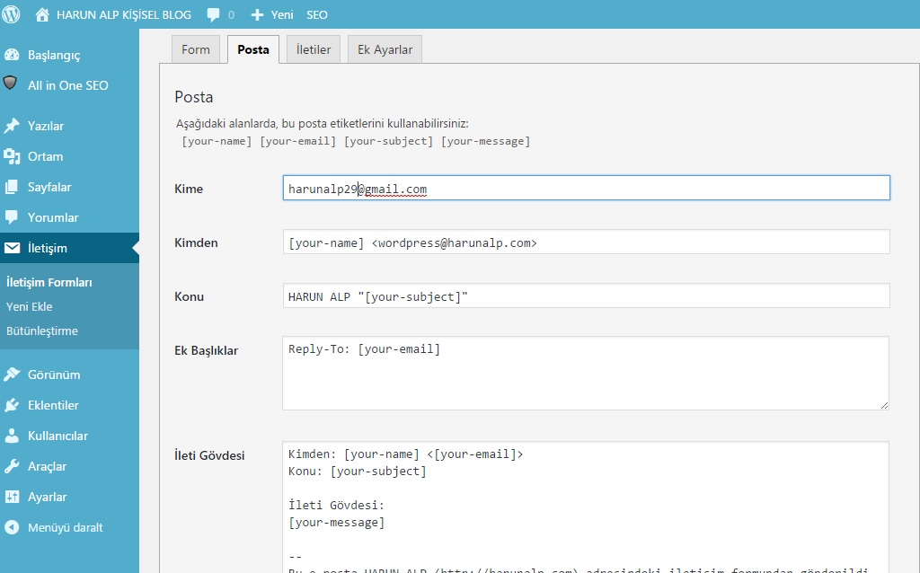 Ardından yukarıdaki menüden Posta seçeneğine tıklayarak gelecek form bilgilerini kontrol edebiliriz. İletinin hangi eposta adresine gideceğini (bu adres varsayılan olarak kullanıcının wordpress’e kaydolduğu eposta adresi olarak belirlenir) belirleyebiliriz. Bu bilgilerinizi buradan güncelleyebilir , İleti Gövdesi kısmında ise mesajların mail adresinde nasıl görüneceğini seçebiliriz.