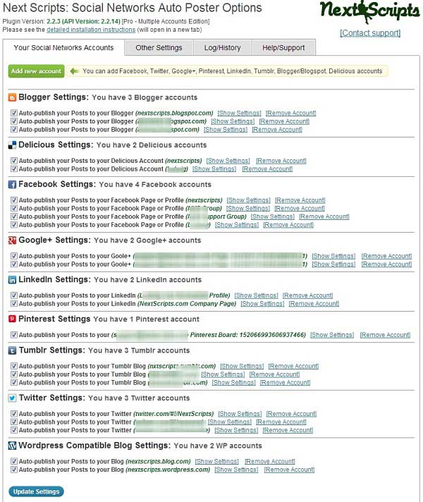İşte wordpress sitenizde yer alan yazılarınızı otomatik olarak sosyal medyalarda paylaşan en güzel eklentiye.Tanıştıralım : NextScripts: Social Networks Auto-Poster. Bu eklenti neredeyse bütün sosyal medya hesaplarında yazılarınızı paylaşmanıza imkan tanır.Facebook, Instapaper, Google+, LinkedIn, Pinterest, StumbleUpon, Tumblr, Twitter, YouTube ve daha birçok sosyal medya hesabı özelliği bulunuyor ek olarak bu hesaplar gittikçe artıyor. Eklentiden bir ekran görüntüsü paylaşayım.